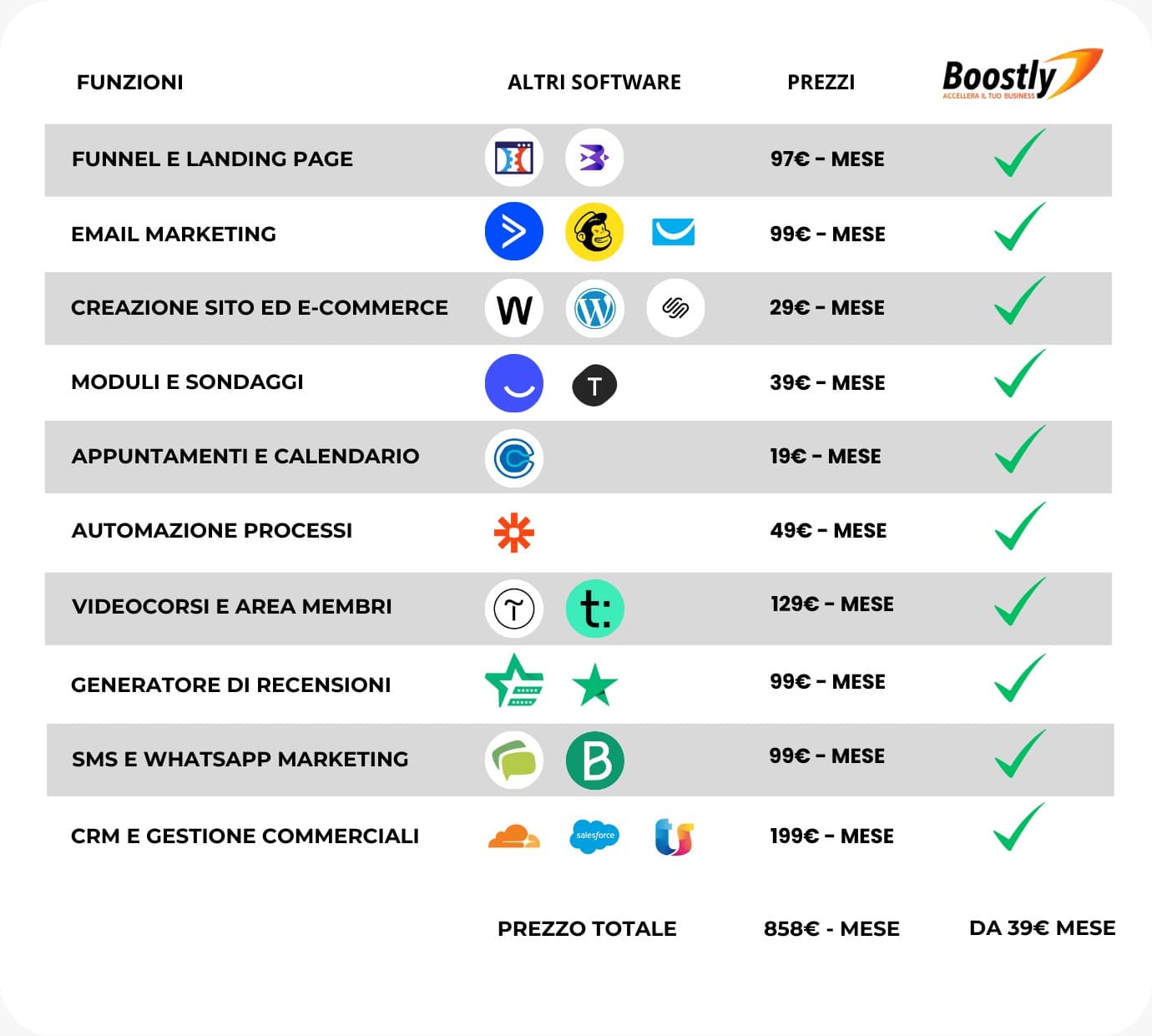 Boostly integra strumenti per la gestione del marketing, dei siti web, dei funnel di vendita, dei social media, dell'analisi dei dati e dei clienti in modo integrato in un’unica piattaforma.